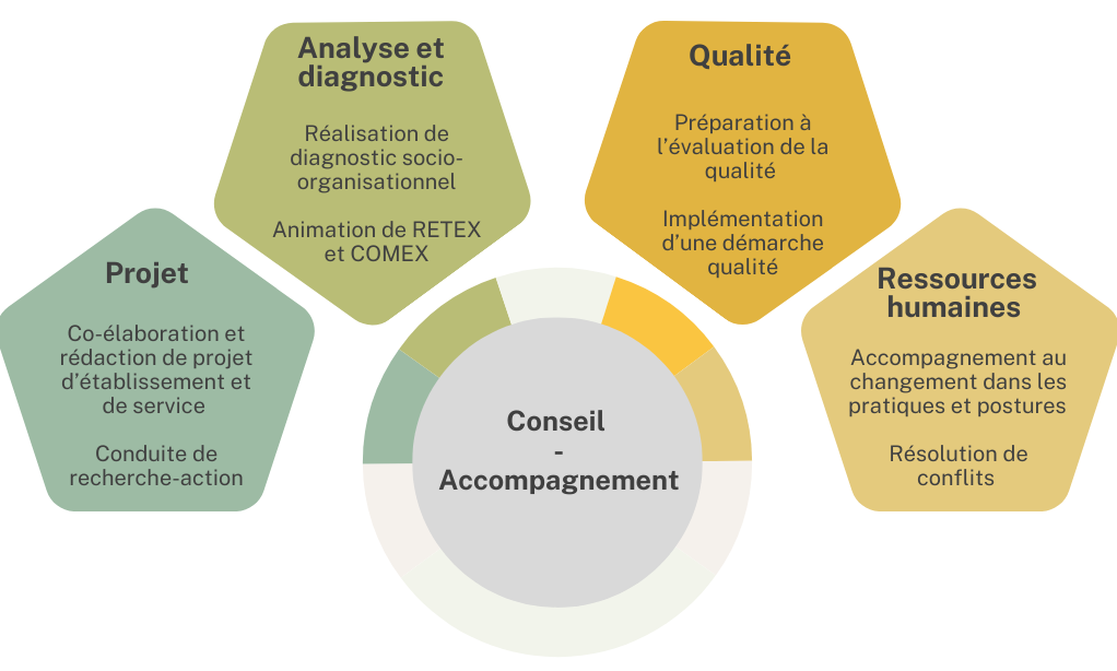 Co-élaboration et rédaction de projet d’établissement et de service: En mobilisant et impliquant vos équipes autour du projet d’établissement, nous vous aidons à analyser et questionner votre organisation, vos ressources, ainsi que votre démarche qualité, tout en co-définissant ensemble les perspectives et orientations futures.